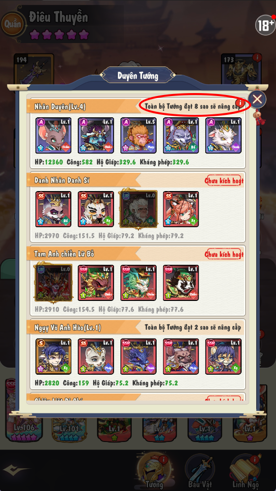 Ngoài ra, khi toàn bộ Tướng trong Duyên Phận đạt hạng sao, Kì Thủ có thể nâng cấp Duyên Phận để tăng thêm chỉ số