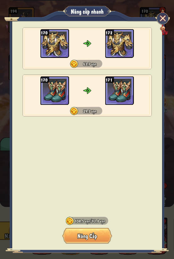 Hãy nâng cấp trang bị thường xuyên để duy trì sức mạnh đội hình và vượt qua các thử thách khó hơn trong game.